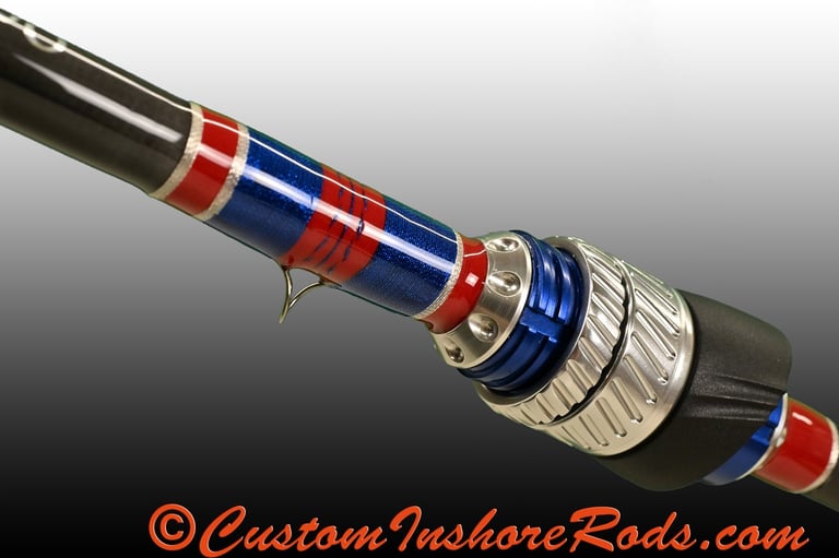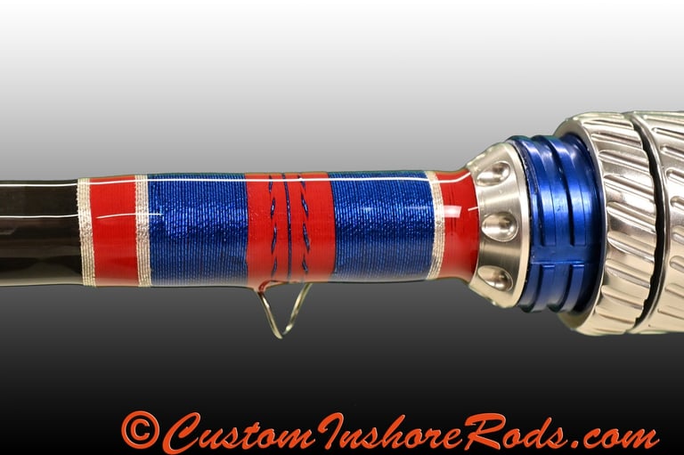 The threadwork ties the entire rod together with a subtle American-inspired color theme. Guides and grip accents are wrapped in bold red thread with crisp silver trim bands, creating a refined contrast against the blue carbon grips and anodized reel seat hardware. The hook keeper is elegantly wrapped with red thread accented by blue metallic and silver metallic trim, forming a distinctive focal point that reflects the rod’s patriotic design influence while maintaining a clean, professional aesthetic.