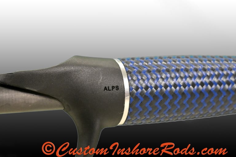 The handle features striking blue carbon fiber split grips and fighting butt, creating a lightweight, high-performance grip system with bold visual character. Anchoring the reel is a premium ALPS split reel seat with a blue anodized aluminum threaded barrel and silver dual-ring locking hood, providing a secure, vibration-free reel platform while reinforcing the rod’s distinctive color palette. Silver winding checks and trim rings complete the handle assembly with a clean, polished finish that complements the rod’s refined craftsmanship.