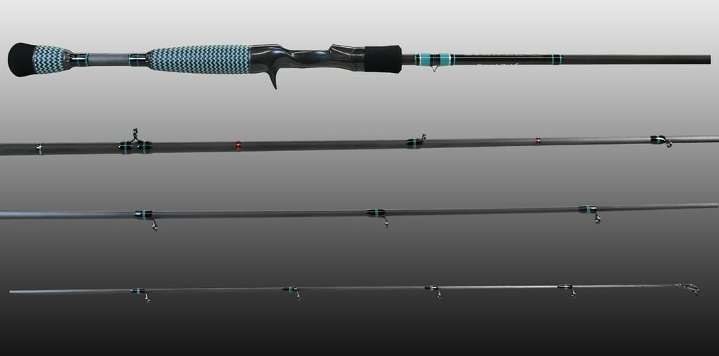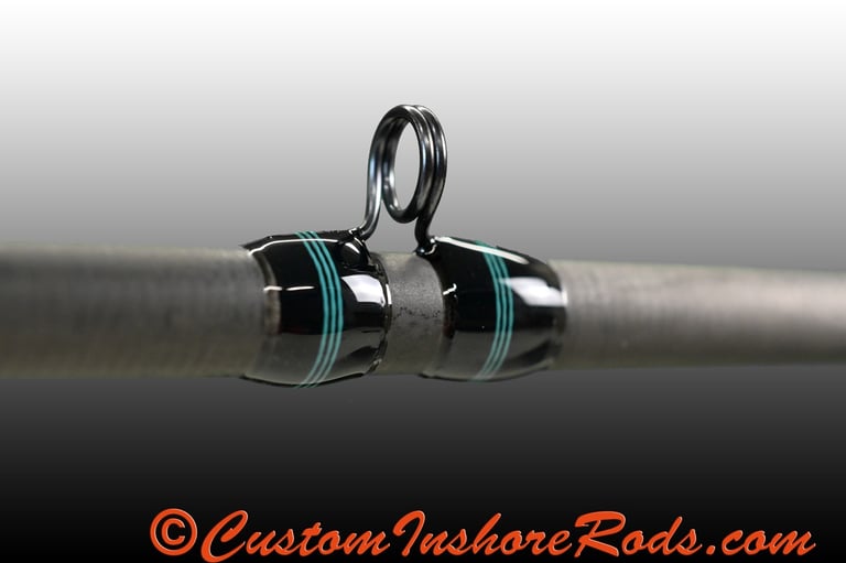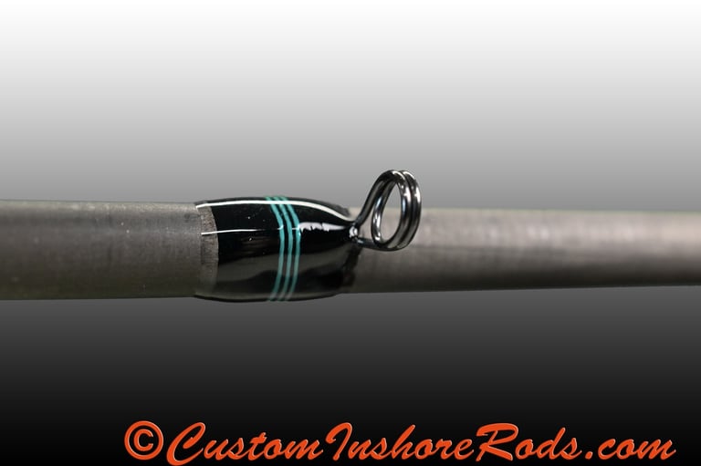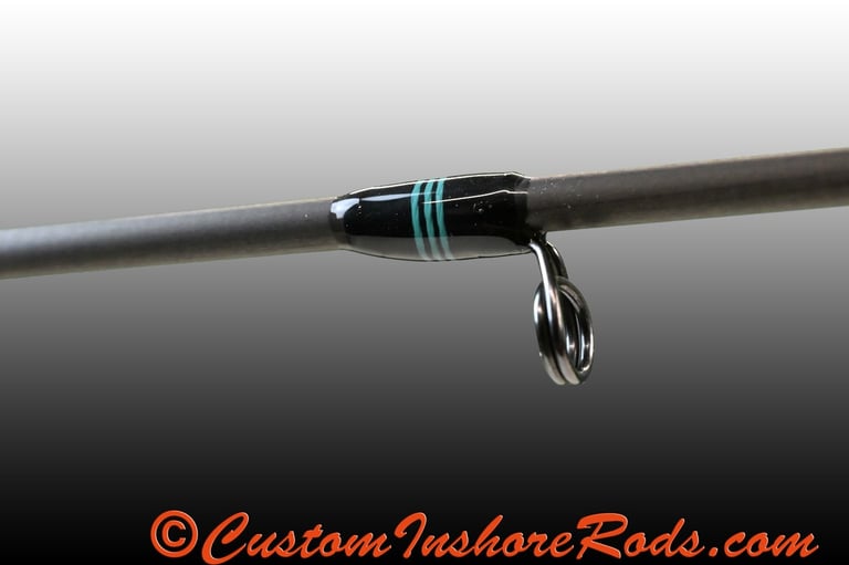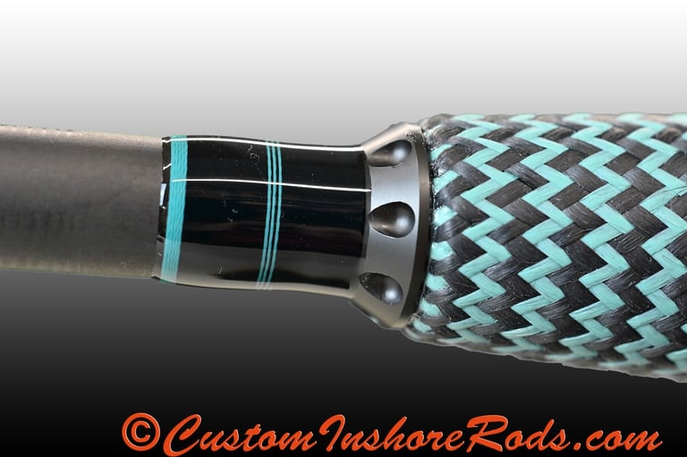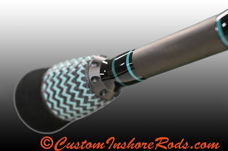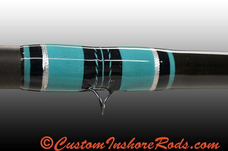 The handle is outfitted with seafoam carbon fiber split grips, paired with satin gray titanium trim rings and winding checks for a clean, modern contrast. Custom threadwork in the split-grip section adds visual depth, while thread-wrapped min/max markers for Texas speckled trout and redfish provide practical, on-the-water reference points. A low-profile titanium hook keeper completes the build without disrupting the rod’s sleek lines.